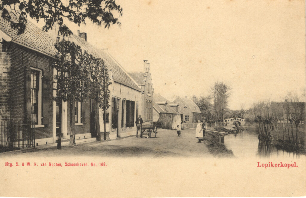 Deze ansichtkaart prijkt op onze homepage. Dit beeld van Lopikerkapel is kenmerkend voor de hele omgeving. Een watergang, hier de Enge IJssel, met knotwilgen, in de verte een hoge brug zodat de trekschuiten goed konden passeren, een langhuisboerderij over het water en verschillende andere gebouwen langs de weg. In de sloot weken de wilgentenen. In de tijd dat de tenen geschild moesten worden, was de hele bevolking van Lopikerkapel, inclusief de kinderen, hiermee bezig. Ook een grote bos ‘witte’ geschilde tenen is zichtbaar. Op de weg staat een hondenkar, zoals gebruikt door handelaren, melkboeren en bakkers (mogelijk – de kar lijkt wel erg groot).